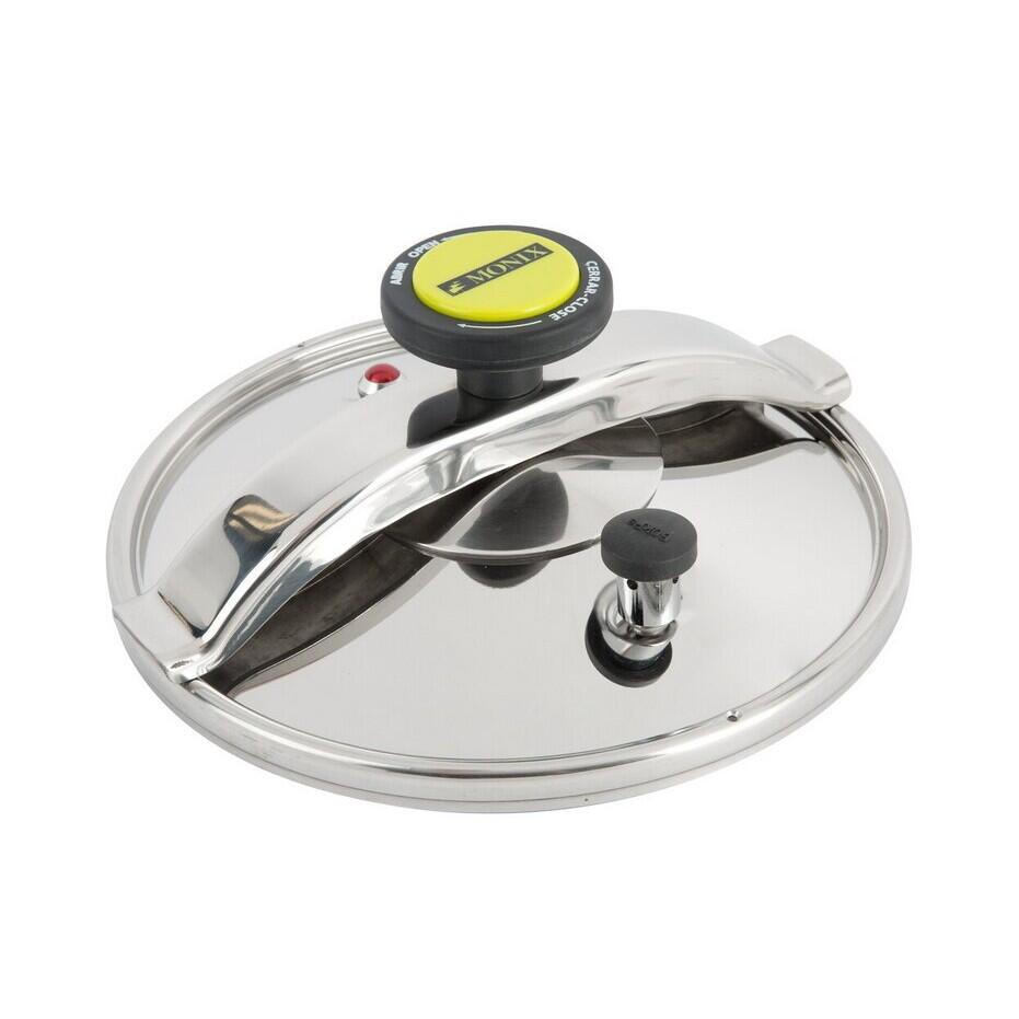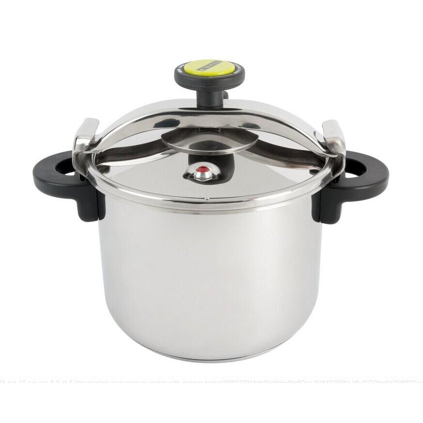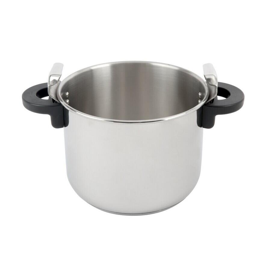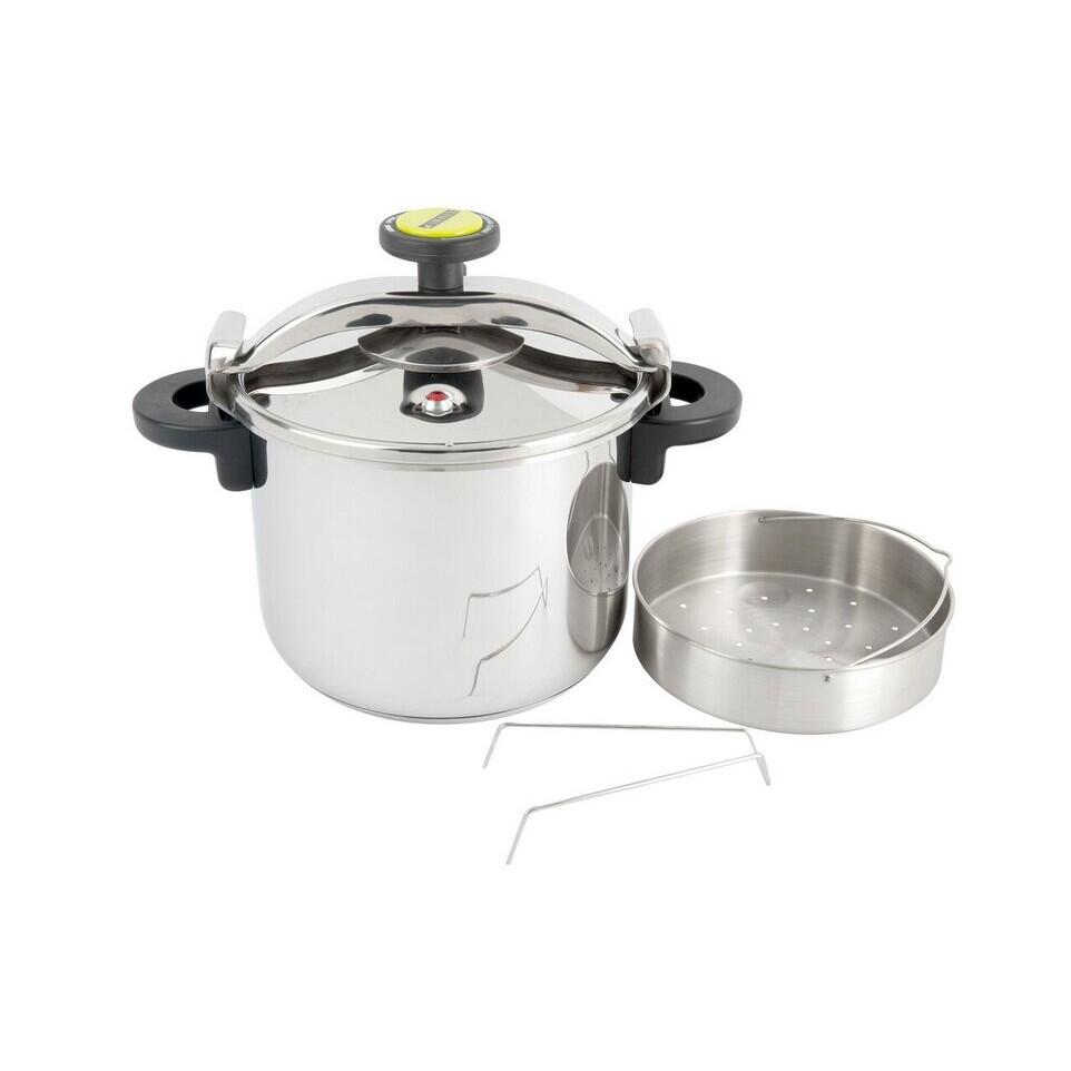 Oala de presiune, din inox 18/10, cu baza baza tripla: inox - aluminiu - inox, garnituri din silicon, manere din plastic, capac cu inchidere rapida.